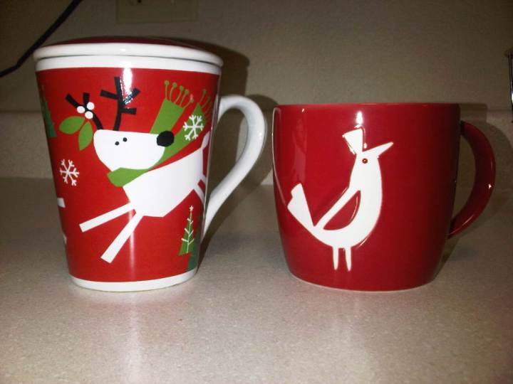 Here are my two mugs as promised! The mug on the right is from Starbucks, I got it Sunday during their 12 days of Christmas specials. Finally using my mobile app 😀 It seems like recently I’m being drawn into red more than green for Chritstmas… Is that a warning? 😛 Hope you like them!