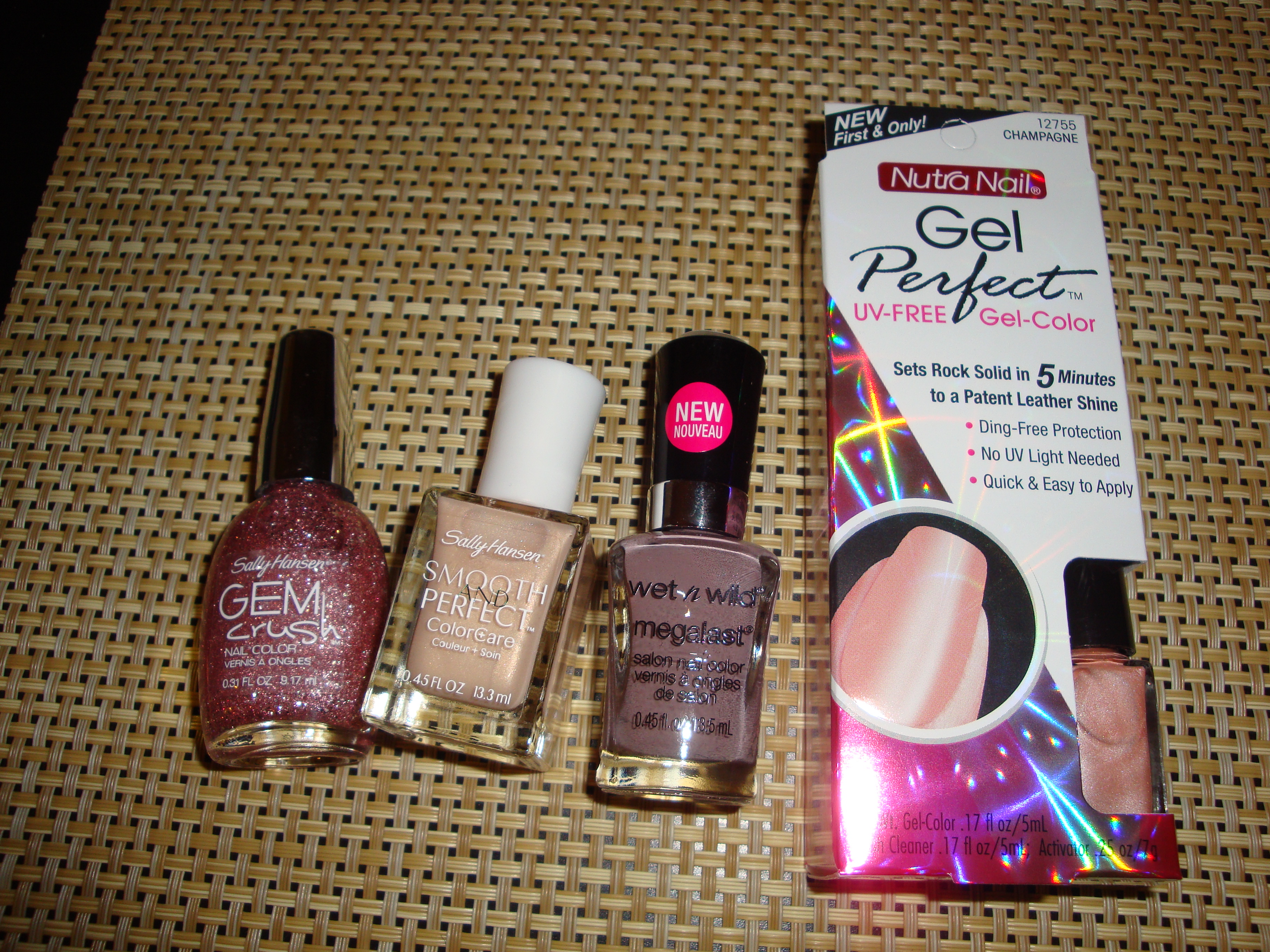 Nail Polish (L ->R): Sally Hansen Gem Crush “Razzle Dazzler (06)”, Sally Hansen Smooth and Perfect Color Care “Dune (03)”, Wet n Wild Megalast “Wet Cement (201C)”, Nutra Nail Gel Perfect UV-Free Gel Color “Champagne (12755)”. I’m always doing my nails and looking for something different but not flashy. I saw the Gel Perfect Nail colour on Dulce’s haul and decided to give it a try as well since my nails are very brittle right now.