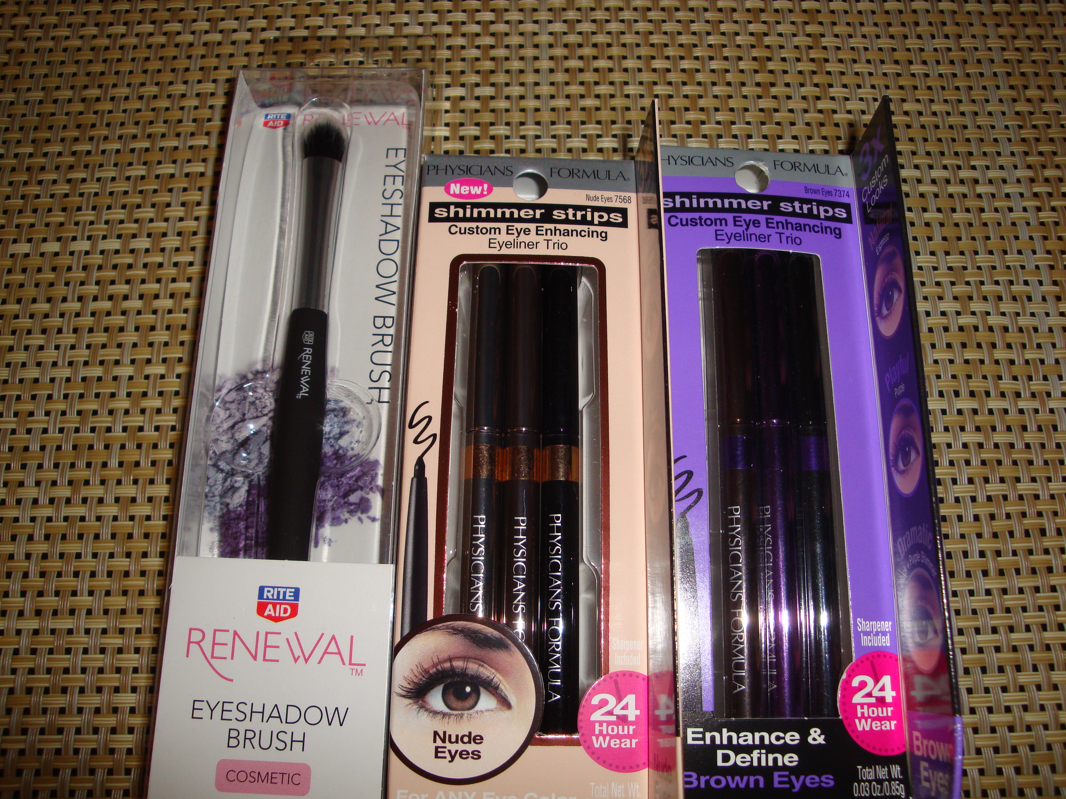 Eyeshadow Brush & Eye liner (L ->R): RiteAid Renewal Eyeshadow Brush, Physicians Formula Shimmering Strips “Nude Eyes (7568)” and “Brown Eyes (7374)”. I’m always buying loose brushes because I’m still practicing. My mum got me the MAC brush kit for Christmas and I used it for my make-up on NYE but I like to keep using the cheap brushes for practice as I am NOT a pro. The eyeliners are also a pick by Dulce, and besides lipglosses/lipsticks I love eyeliners, so I decided to give these a try as well.