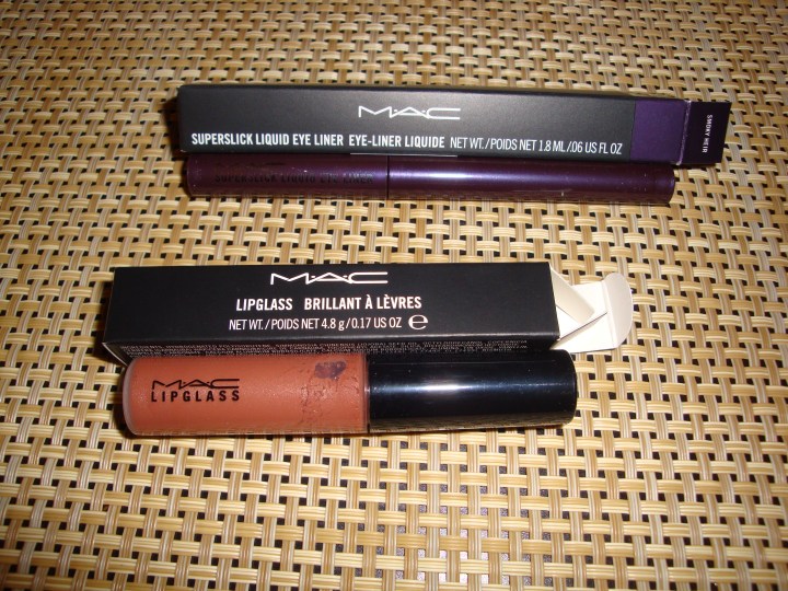 MAC products: SuperSlick Liquid Eye Liner “Smoky Heir” and Lipglass “Hot Spell (A81)”. I stopped by MAC when I was leaving the mall because I received a flyer on their latest collection “Naturally”. The lipglass is from that collection and I want to go back for a lipstick that was also there. It just screamed my name! The eyeliner… Believe it or not, my mother  has me into this coloured eyeliner. We both bought the blue one while I was home but they were out of the purple so I just got it. I ‘ll have to go back and get hers or else I’m in big trouble lol.