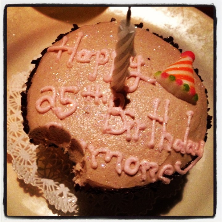 This weekend I celebrated my 25th Birthday. The last time I had so much fun, I turned 21. Even though I wasn’t surrounded by lots of family and friends like I was for my 21st, the love I felt from the few was enough to make me feel like there were many and the luckiest girl in the world. We didn’t do Vegas like we did for my husband but I felt like I was in Vegas even though I was home. I started my celebrations Thursday night by going to Reggae Night at this lounge downtown Seattle and there were three of us and we had a BLAST. Friday, (a little out of it from Thursday night) I spent the whole day out, then dinner and club time… which left me nursing a mini hangover on Saturday – my actual birthday. However! I was able to recover, get dressed, and go for round 3 – dinner and club again!!! We had dinner at this restaurant and I couldn’t eat all of my birthday cupcake (that my husband made sure he got for me even if it wasn’t a whole cake) and we got our coats and in leaving I forgot the cake on table. Before we even got back to the car I remembered it and my husband went back for it and they threw it out!!! Even worse is the fact that I had asked for the box back because I couldn’t eat all of the cupcake, so they “should” have known it wasn’t empty. He was more upset than I was about it. I knew he hated that I couldn’t enjoy the one thing that meant the most to him. I told him I’m having such a wonderful time that something like that won’t upset me. I felt too blessed. I’m simply not supporting that restaurant anymore (it was one that people told me was good and it wasn’t to me and I’ve never had a restaurant throw out something so quickly that I’d left behind). I didn’t want it to spoil my night, so I’ve just decided to not have anything to do with them. The little bite is all I was able to enjoy.