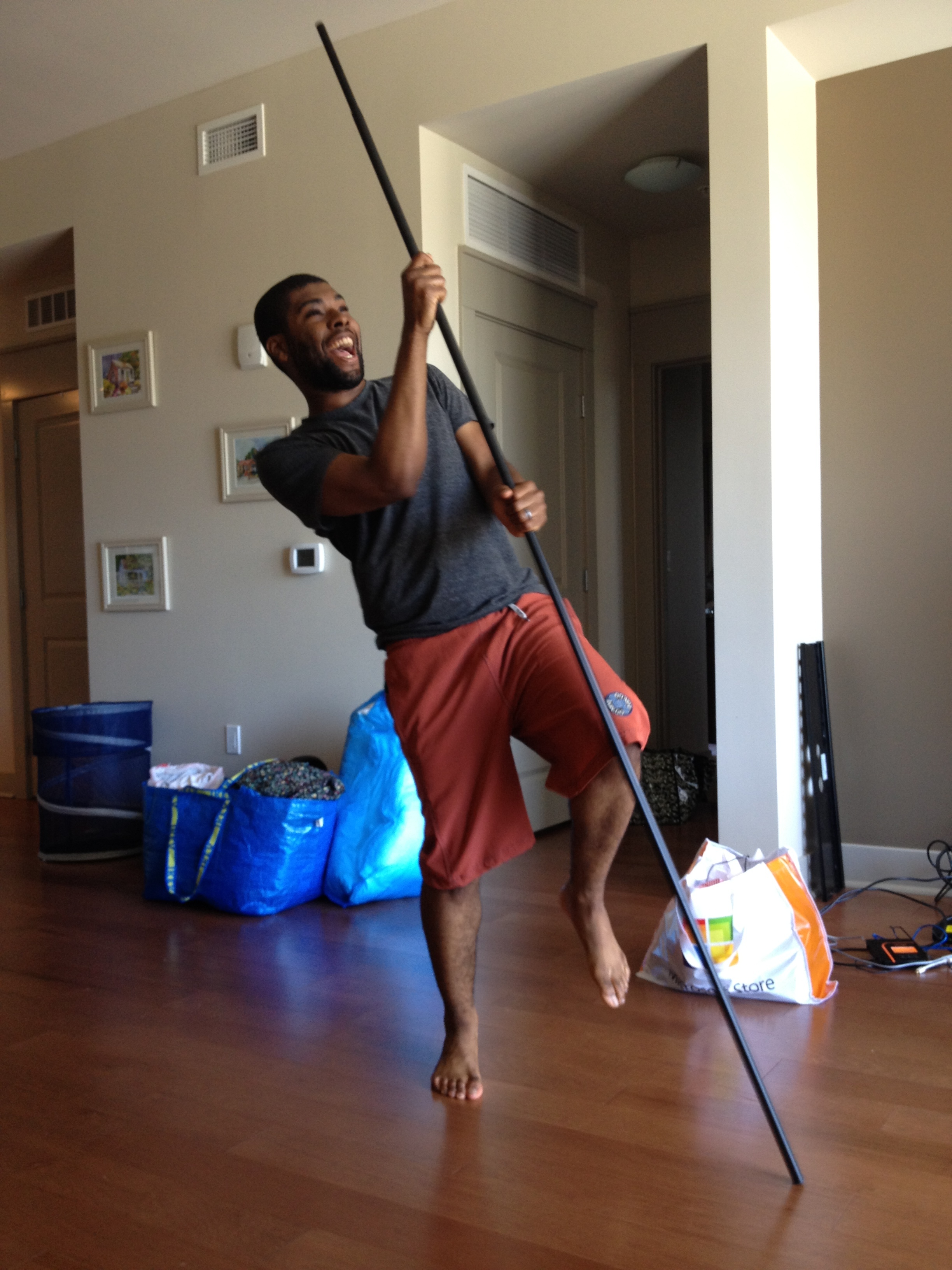 Just for laughs: David trying to pole vault with a curtain rod after watching the Olympics >_<