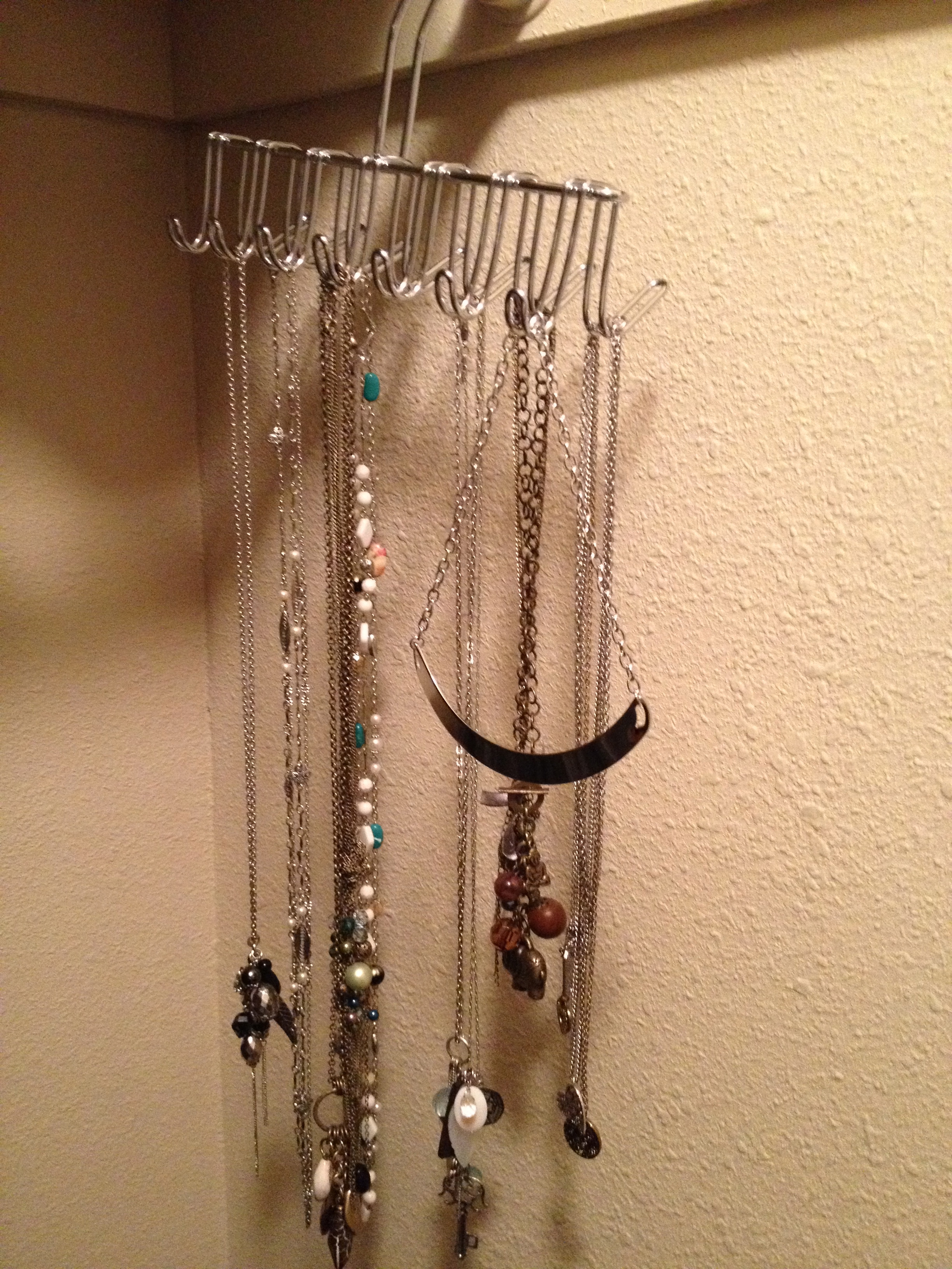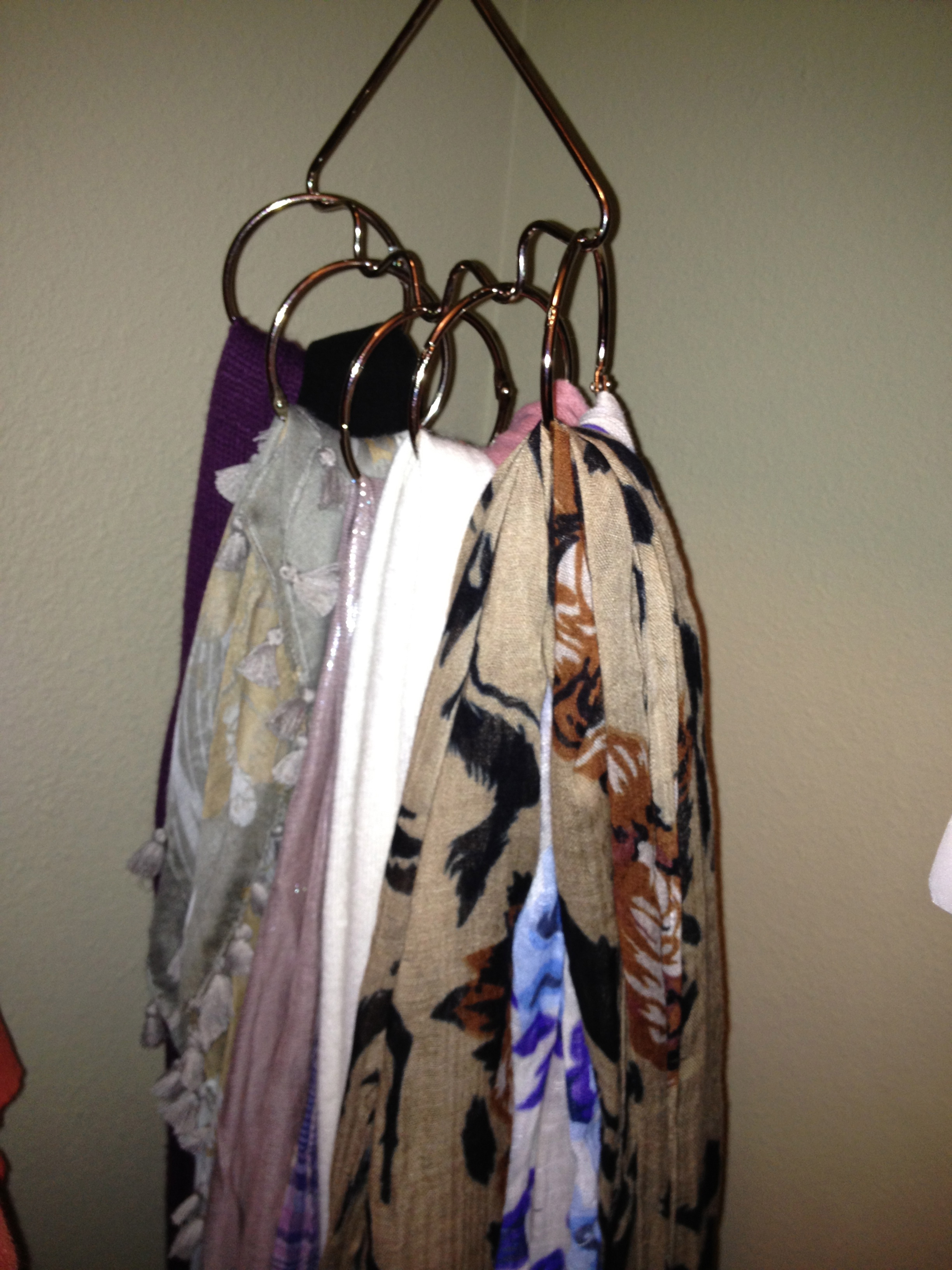 As I said before I wanted to move my scarves to the accessory belt and get proper belt hanger for my belts. I bought two belt hangers today – one for my belts and one for my necklaces. I sorted my belts first as there are a few to get rid of that I never wore or liked. I also have a few belts that do not have anything for me to hook them with so I closed them up and put them on one of the rings with the scarves.