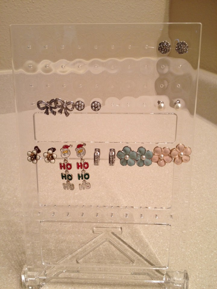 These strips here are another piece of what this title is all about. I had bought a piece of this plastic (I never  remember the name of it) to hook my long earrings on just to keep them together. What I also did was cut smaller pieces to attach all of my earrings to when travelling. This way I know they’re all together and I don’t have to worry about the being scattered all over a bag.