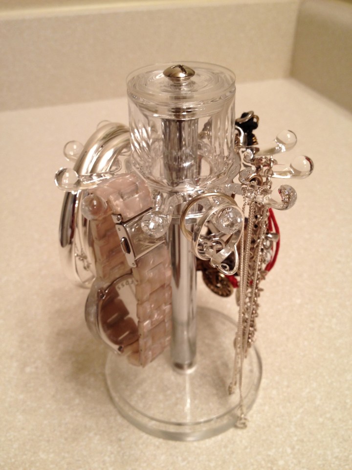 The lipstick holders were practically next to the jewellery stuff, and since I’ve been saying for years I need something to store my jewellery properly, I decided to have a little look at what was available. I bought a spinning bracelet holder, an earring rack and as I said before, a hanger for the necklaces. I haven’t transferred all of my necklaces as yet because I have a few that I no longer wear and I really want to sort through them. I still need to find something for my bangles but I just may end up getting one of these considering their shape. I wanted to go to Michaels to see if I could get creative and make up something on my own but laziness may get the better part of me. Below you will see a round mason jar with earrings on it and stuff on the inside. As I was taking pics today, I realised that before Pinterest, I was coming up with my own uses for mason jars outside of the kitchen! (This is what gave me the idea for the title of this post :)) Anyway I needed something else for the earrings as I had more than when i first started doing this and obviously all couldn’t fit. I cleaned out most of my kitchen cupboards Saturday and that’s when I’d placed this lovely vase on the dinning table with some other stuff to go somewhere else. I decided to use it because the earring holder I bought wasn’t able to accommodate all of my long earrings and store all of my costume rings on the inside (2 for 1 ;)). I was about to return it when I realised I still needed something for my studs so I decided to keep it (I know it looks scanty but I prefer long earrings and don’t want my studs laying around anymore).