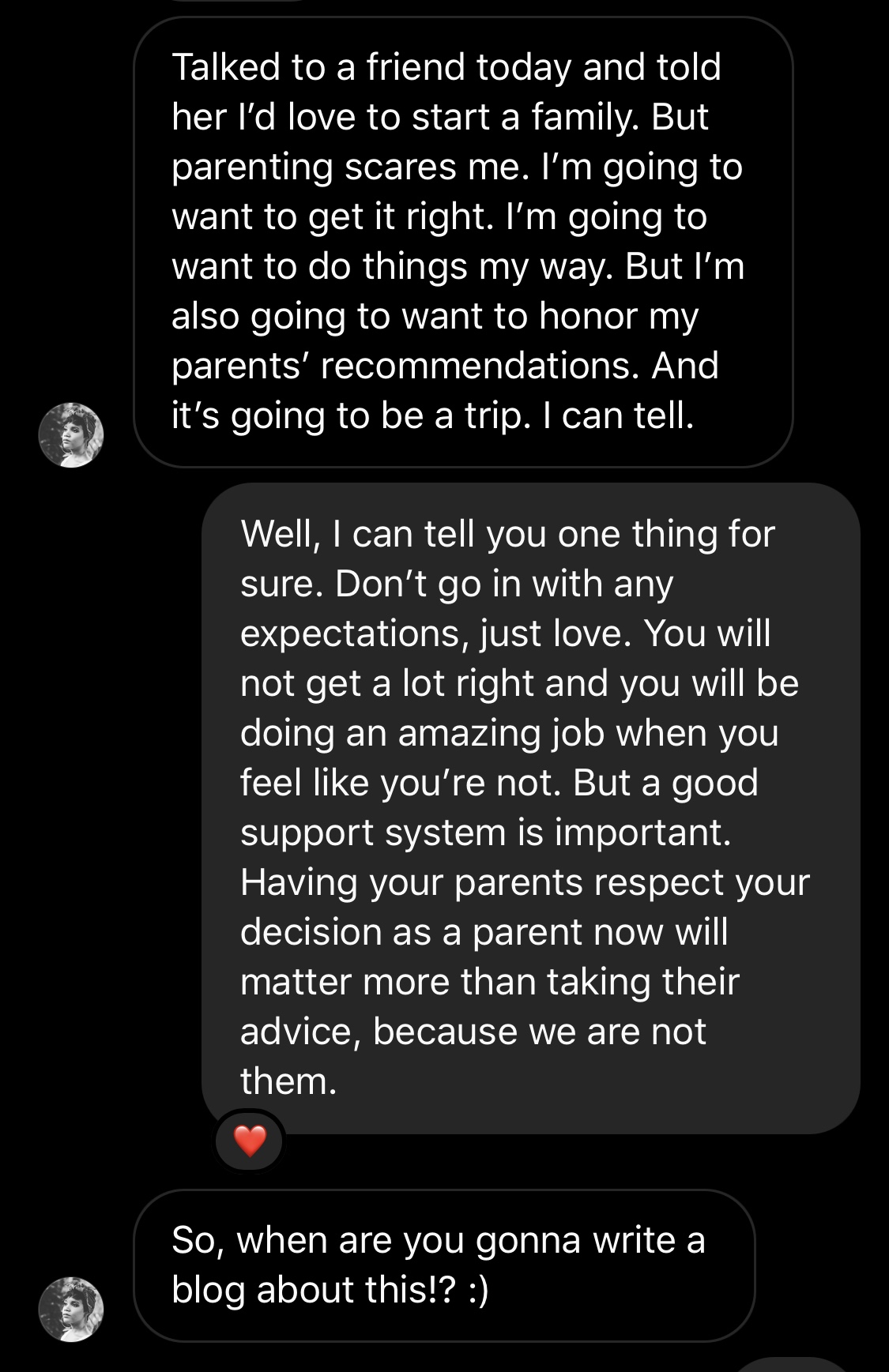 As my friend mentioned above, she wanted to honor her parents’ recommendations. Well, that’s just what they are – recommendations. Someone you trust recommends a restaurant to you but when you see the menu and realize it’s not a place you’d enjoy as much as them, you say thank you and then make your own decision on where to eat. It’s kind of the same here. You know what’s best for your kid(s) and you. You have to consider how you want your child to be raised, what is different about you now than when you were kid and what you want for your child going forward. There’s more to consider – a different environment, different cultures (you and your partner), different upbringings… the list goes on. But this is your family now and while recommendations from family/friends are always great to receive, never feel obligated to do it because of who said it to you, and trust your gut. Some advice can bring you peace. Like when my mother recommended adding rice cereal to my son’s last bottle to help him stay full longer and not wake as often to feed. He was about 9 months+ and a hefty kid that loved to eat. He was still waking every 2-3 hrs and after I added the cereal to his “last” bottle for the night, he was sleeping in much longer stretches and so were we. Then on the other spectrum, she also suggested the standard discipline we grew up with when he misbehaved sometimes, but I wanted to change that narrative. Again, you do what you know is best for your family in your situation.